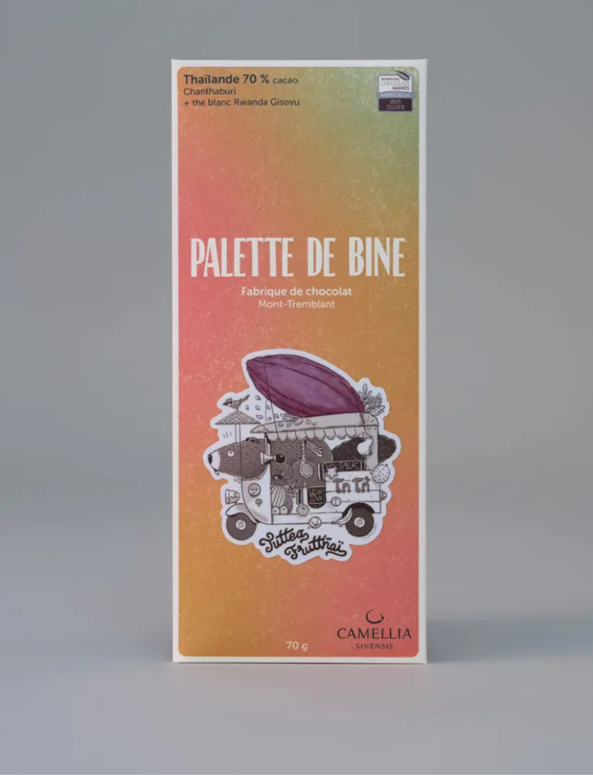 "Le chocolat de Palette de Bine est produit en petites quantités avec un franc respect de la qualité de notre ingrédient essentiel, la Bine de cacao. Nous vous offrons des bines choisies auprès de producteurs indépendants à travers le monde. Notre cacao est torréfié, vanné, broyé, conché, vieilli, tempéré, moulé et emballé à la main dans notre atelier à Mont-Tremblant."