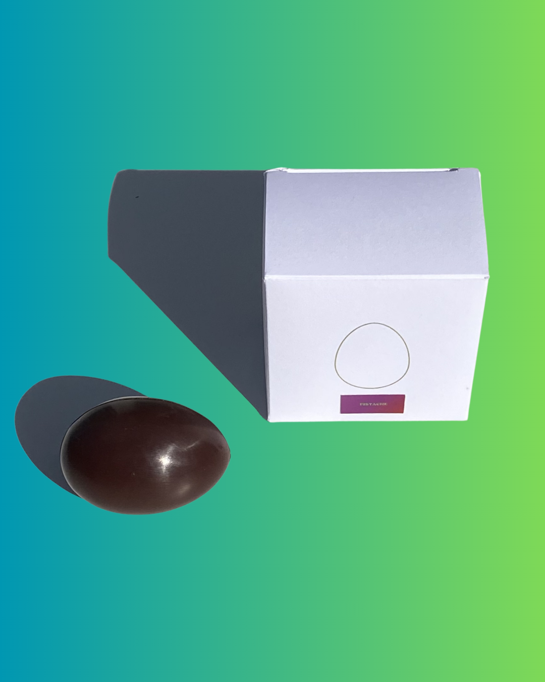 Oeuf de Pâques délicieusement garni d'un praliné crémeux de pistache, sucre d'érable et de riz croquant. Magique.