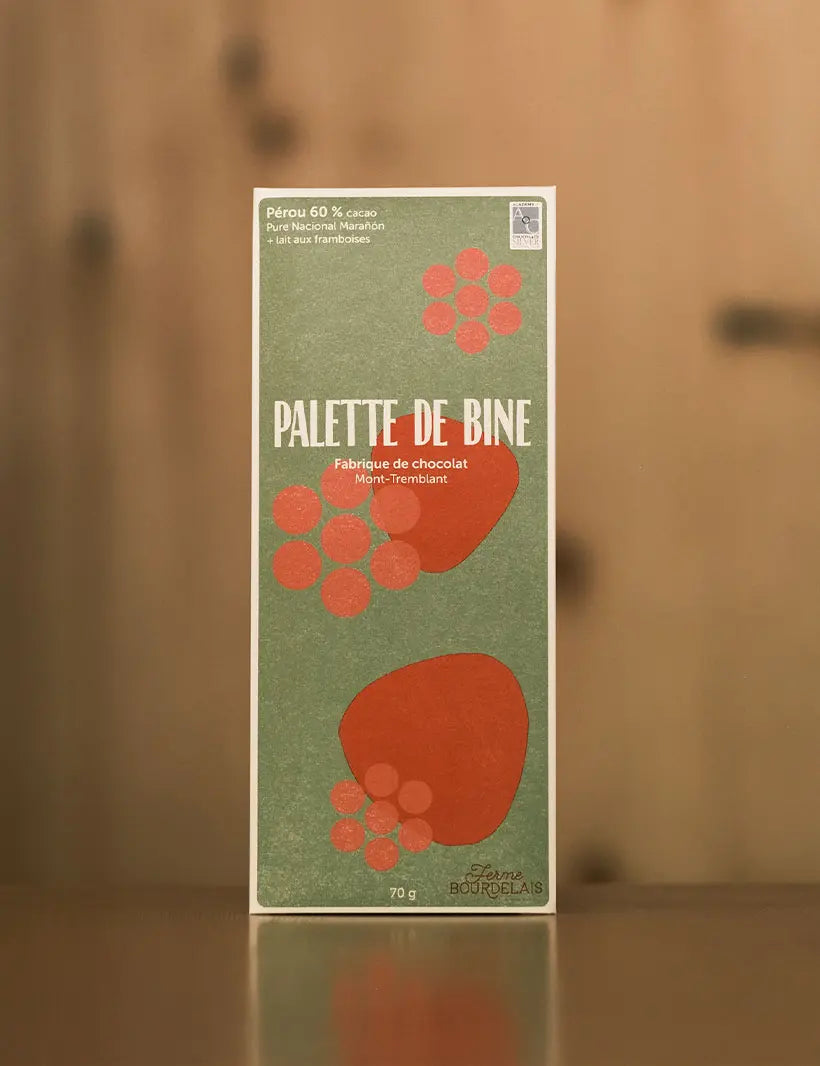 "Le chocolat de Palette de Bine est produit en petites quantités avec un franc respect de la qualité de notre ingrédient essentiel, la Bine de cacao. Nous vous offrons des bines choisies auprès de producteurs indépendants à travers le monde. Notre cacao est torréfié, vanné, broyé, conché, vieilli, tempéré, moulé et emballé à la main dans notre atelier à Mont-Tremblant."